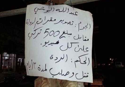 Le vittime sono appese circa un isolato l’una dall’altra, e alcune delle vittime hanno dei cartelli che ne indicano il mancato rispetto del Ramadan.