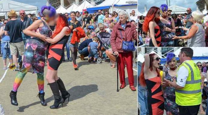 Mog Wilde e la ‘marita’ Freya, entrambe/i di 35 anni, di Pembrokeshire, stavano visitando il Food Festival di Cardiff dove hanno cominciato a dare spettacolo davanti a famiglie (vere) e bambini.