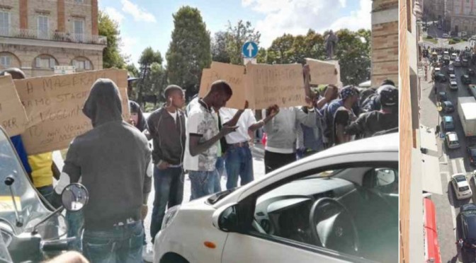 Scene di guerriglia urbana a Macerata. Con decine di giovani maschi africani urlanti ed esagitati che hanno bloccato un intero tratto stradale: pretendono di essere riconosciuti come ‘profughi’.
