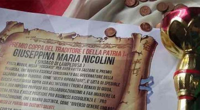 Il pacco che verrà recapitato al Comune di Lampedusa conterrà una coppa (“I° Classificata – La coppa del traditore della Patria”) corredata da una pergamena recante la scritta: