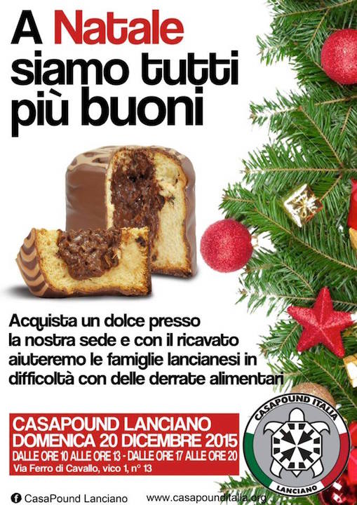 LANCIANO – Una vendita di dolci di produzione tipica locale, il cui ricavato verrà interamente destinato alla raccolta alimentare per le famiglie locali bisognose. E’ la bella iniziativa che avrà luogo domenica 20 Dicembre nella sede lancianese di CasaPound Italia, in via Ferro di Cavallo 13, per l’occasione aperta dalle 10 alle 13 e dalle 17 alle 20.