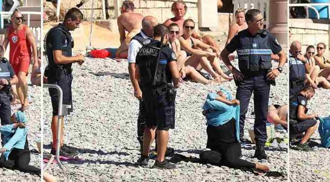 A Nizza, la polizia fa spogliare una donna musulmana che indossa un burkini in spiaggia nonostante il divieto. Un gesto di sfida e sfregio alle vittime della strage islamica: