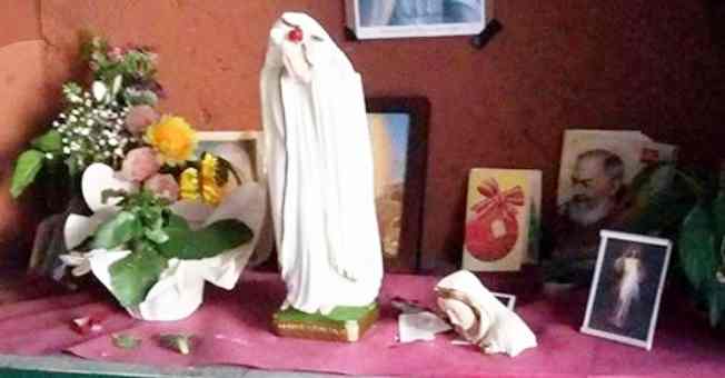 La Madonna è stata decapitata; la testa è stata poi posizionata ai piedi della statua in segno di ulteriore sfregio ai fedeli. Chissà chi è stato…