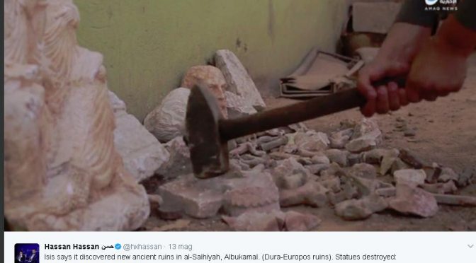 L’iconoclastia islamica fa nuove vittime. Il video, diffuso dall’agenzia di stampa del Califfato, Amaq, mostra un miliziano islamico che distrugge a martellate statue e altri manufatti di epoca romana rinvenuti nel sito archeologico di Dura Europos, che si trova nei pressi della città di al-Bukamal, nella provincia siriana di Deir Ezzor, al confine tra Siria e Iraq.