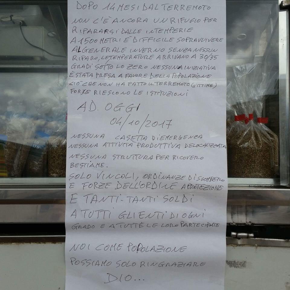 E’ la disperata denuncia dei terremotati di Castelluccio di Norcia (Perugia) affidata a una lettera affissa sul vetro di una roulotte.