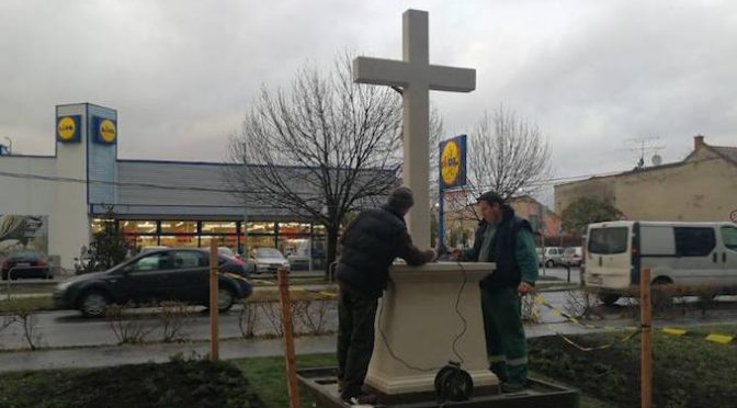 Un’enorme croce eretta di fronte alla Lidl, per protestare contro alcune scelte di marketing che censurano l’identità cristiana d’Europa.