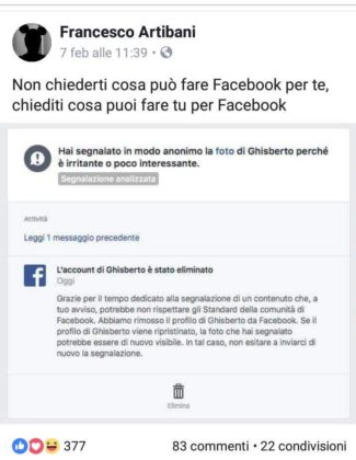 Al di là del segnalatore molesto che ne rivendica la morte digitale – che incredibilmente è un altro disegnatore, tal Francesco Artibani – è evidente il disegno perseguito dal social network: eliminare le pagine non di sinistra in previsione delle elezioni.