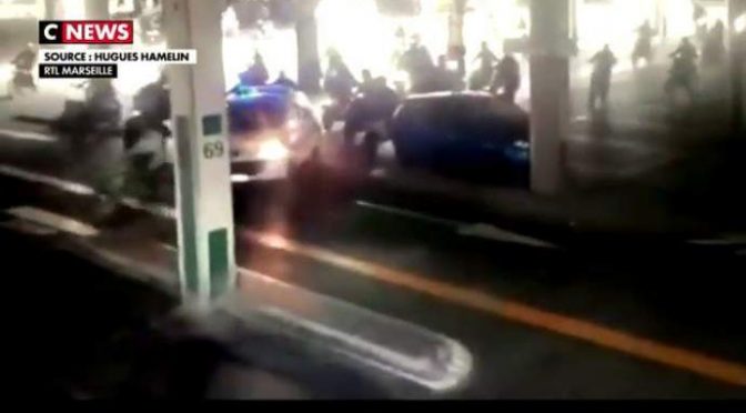 Dopo l’imboscata a colpi di kalachnikov in cui sono cadute giorni fa alcune pattuglie di polizia a Marsiglia, ecco sempre nella stessa città un’auto della polizia che viene scortata fuori da un quartiere islamico da ‘truppe’ in moto: