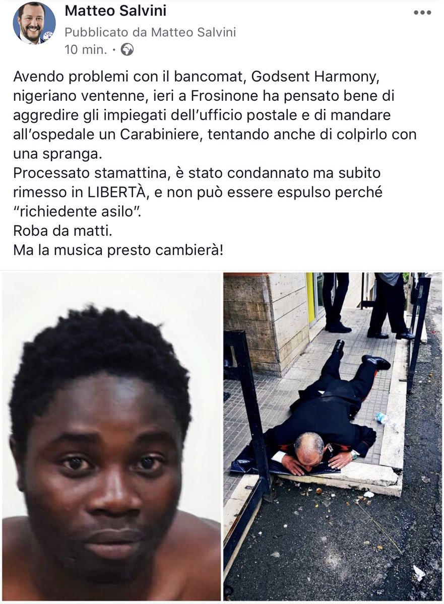 Dd9-ummU0AYBnch Maggio 24, 2018 881 × 1199 Carabiniere steso a sprangate da profugo, Salvini: “Sto arrivando io” Vox Condividi!