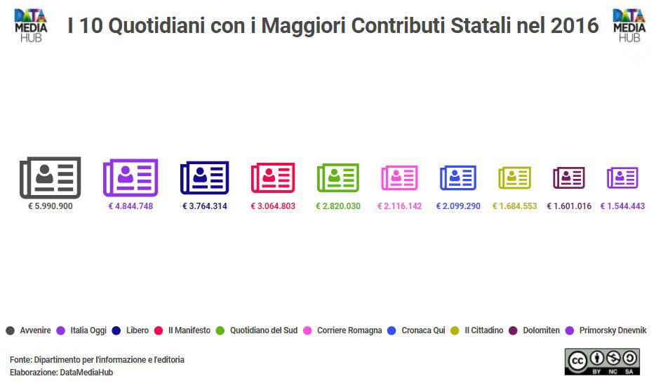 Dopo che ad Agosto 2017 erano stati pubblicati gli importi relativi all’anticipo versato dallo Stato alle testate per il 2016, ora il Dipartimento per l’Informazione e l’Editoria ha reso noti i dati di consuntivo relativi ai finanziamenti all’editoria, alla carta stampata, nel 2016: