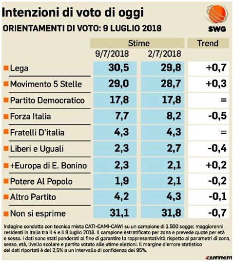 Una crescita, quella della Lega, inarrestabile. Ormai stabilmente sopra la soglia psicologica del 30 per cento.