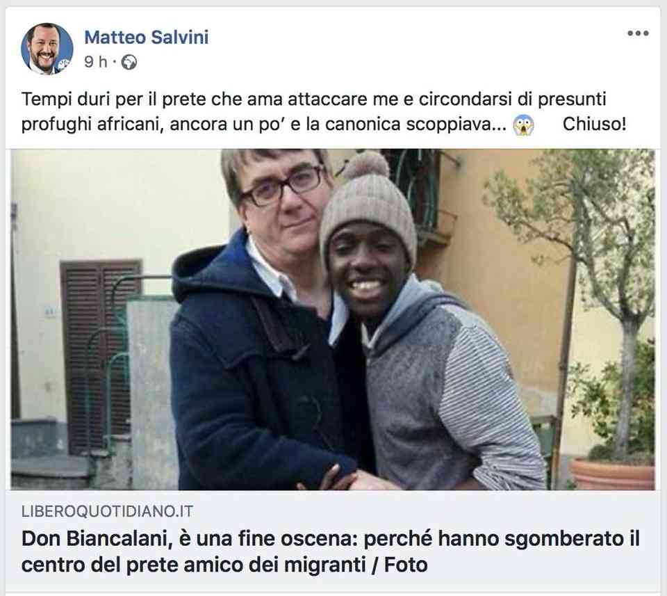 “Tempi duri per il prete che ama attaccare me e circondarsi di presunti profughi africani, ancora un po’ e la canonica scoppiava… Chiuso!”, ha twittato nei giorni scorsi Salvini dopo che la prefettura di Pistoia, dopo l’ennesimo ritrovamento di droga nella canonica e le bufala diffusa di un attacco razzista, aveva disposto la chiusura di parte del centro di accoglienza dove il prete ospita i profughi a spese dei contribuenti.