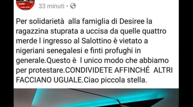 Adesso ci penseranno i carabinieri a chiarire chi, in carne e ossa, ha pubblicato il post sulla pagina sociale del Salottino Del Ponte, circolo aperto da poche settimane nel centro di Susa. Perché mica devono occuparsi di chi spaccia e uccide ragazzine, no, di chi protesta con post su internet.