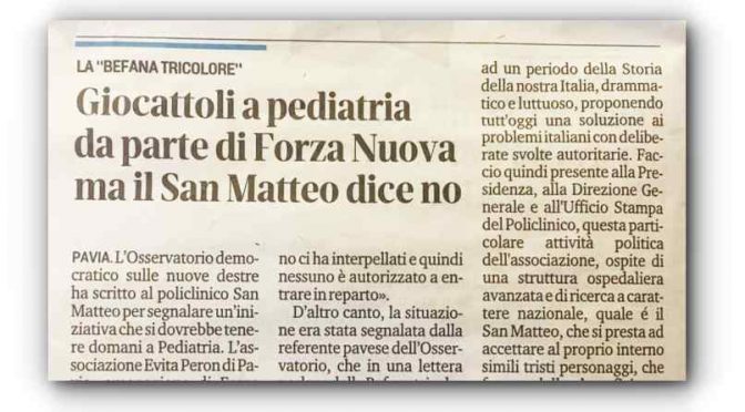 BREAKING NEWS, LOMBARDIA Bimbi senza regali perché la Befana è ‘fascista’ Gennaio 7, 2019 Vox 3 commenti Vox Condividi!VERIFICA LA NOTIZIAChe vergogna. I bimbi hanno dovuto rinunciare alla Befana perché i regali erano ‘fascisti’: Vox Lasciate la politica fuori dagli ospedali. Chi porta regali ai bambini malati va ringraziato: chiunque sia. Comunista, fascista o rettiliano. Segui Vox
