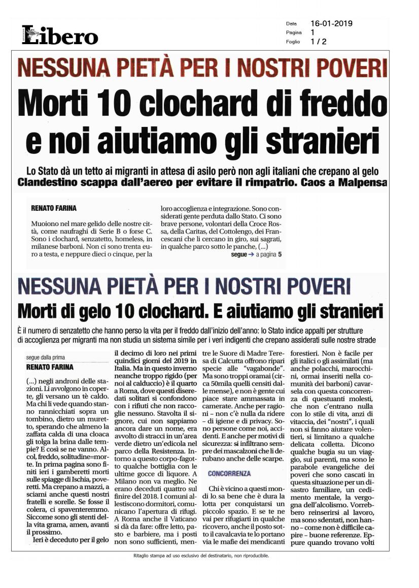 Continua nell’indifferenza di Vaticano, Ong e buonisti vari, la strage italiana di senzatetto.