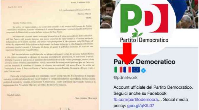 Il governo francese attacca quello italiano, quindi la sovranità nazionale italiana, cosa fa il PD? Scrive una lettera di solidarietà all’ambasciatore francese e issa la bandiera straniera sulle sedi pubbliche e dei propri profili social: