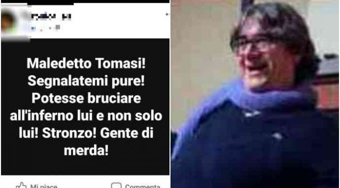 Insultato e offeso su Facebook («Maledetto, potesse bruciare all’inferno»), il sindaco, Alessandro Tomasi (Fdi), replica.