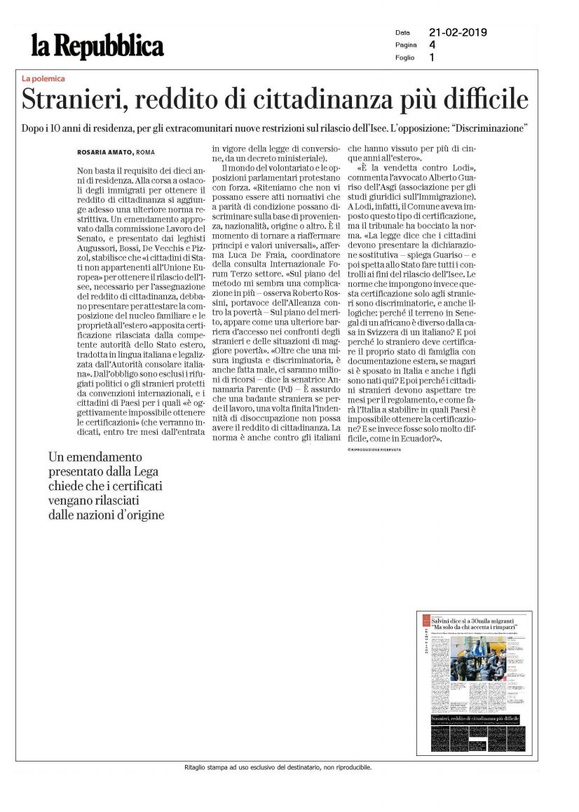 Non c’è nulla di discriminatorio, lo straniero, che già non dovrebbe ricevere il reddito in quanto tale, deve dimostrare di non avere un patrimonio nel suo Paese di provenienza.