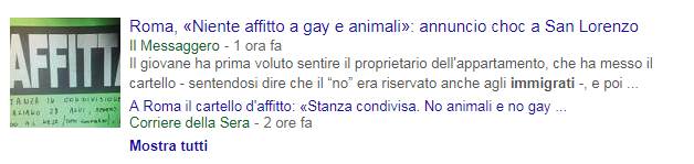 BREAKING NEWS, ROMA «Non voglio convivere con un gay», media scioccati Marzo 2, 2019 Vox Vox Condividi!VERIFICA LA NOTIZIAStanno veramente esagerando: Vox Ora non si può nemmeno decidere con chi condividere la propria casa. Pazzesco. E’ tutto uno ‘choc’. Qui parliamo di convivere. Se qualcuno ha delle preferenze sono cavoli suoi, o vogliamo imporre la convivenza forzata? Segui Vox