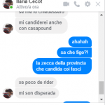 Il caso più divertente fa riferimento alle elezioni comunali di Gorizia del 2017, quando la Cecot sarebbe arrivata a pregare il suo amico “fascio” Christian Zuittoni, chiedendogli di intercedere presso CasaPound perché gli attivisti locali si mettessero a minacciarla, così da ottenere un po’ di visibilità politica.