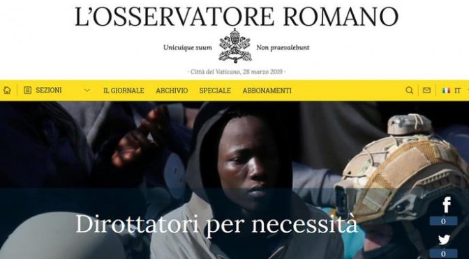 “Dirottatori per necessità”. Questo il delirante e criminogeno titolo del giornale vaticano ‘Osservatore Romano’ in prima pagina, sulla vicenda del mercantile El Hiblu I, sequestrato con la violenza da 108 clandestini soccorsi in acque libiche.