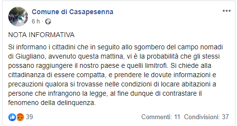 VERIFICA LA NOTIZIAMarcello De Rosa, sindaco Pd di Casapesenna, comune del Napoletano, avvisa i suoi cittadini del pericolo che si verifichi una ‘calata dei Rom’ sgomberati dal campo nomadi di Giugliano e acquartierati a un passo da Castel Volturno, che potrebbero esser tentati di penetrare l’entroterra alla ricerca di case: