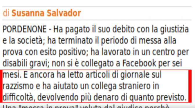 PORDENONE – Ha pagato il suo debito con la giustizia e la società; ha terminato il periodo di messa alla prova con esito positivo; ha lavorato in un centro per disabili gravi; non si è collegato a Facebook per sei mesi. E ancora ha letto articoli di giornale sul razzismo e ha aiutato un collega straniero in difficoltà, devolvendo più denaro di quanto previsto. Una “messa in prova” voluta dal giudice perchè aveva postato, insieme ad altri due, frasi razziste su Facebook. È dunque chiusa la vicenda processuale di Gabriele Marian, 56 anni di Concordia Sagittaria il quale, assieme ad altre tre persone (tutte residenti nello stesso comune veneto), si contestava la violazione della legge Mancino, con l’aggravante della discriminazione razziale contestata dalla Procura di Pordenone, per aver postato frasi razziste sul profilo Facebook “Sei di Portogruaro se…” nel luglio 2017.