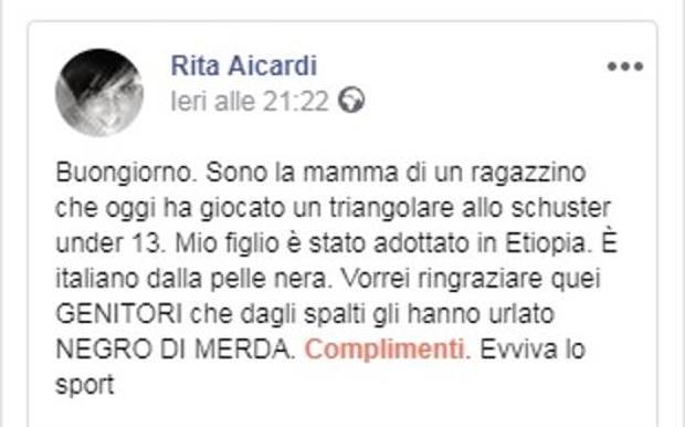 Lo scrive su Facebook la ‘madre’ di un ragazzo africano che partecipava a un triangolare al Centro Schuster di Milano: “Mio figlio è stato adottato in Etiopia. È italiano dalla pelle nera”. E’ un africano adottato, non è ‘italiano’.