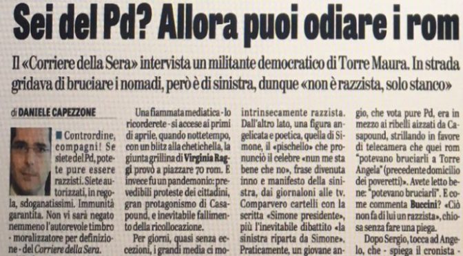 Il «Corriere della Sera» intervista un militante democratico di Torre Maura. In strada gridava di bruciare i nomadi, però è di sinistra, dunque «non è razzista, solo stanco».