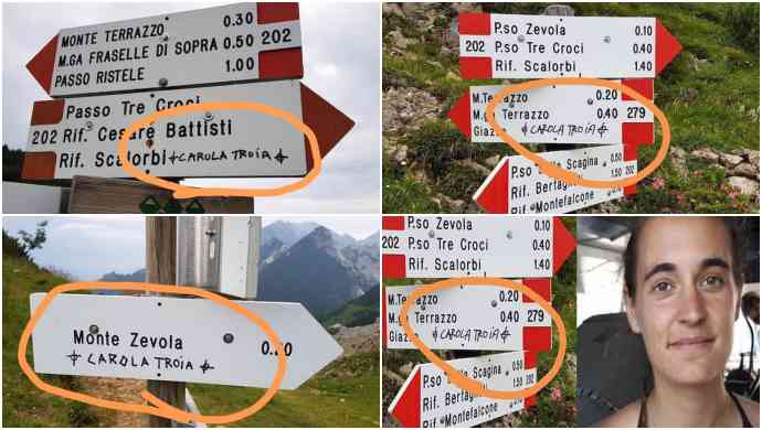 Croci celtiche, noto simbolo della tradizione europea, ed insulti espliciti sono apparsi sui cartelli direzionali lungo i sentieri del Carega, fra il monte Zevola e il monte Terrazzo, nel Veronese.