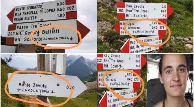 Croci celtiche, noto simbolo della tradizione europea, ed insulti espliciti sono apparsi sui cartelli direzionali lungo i sentieri del Carega, fra il monte Zevola e il monte Terrazzo, nel Veronese.