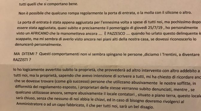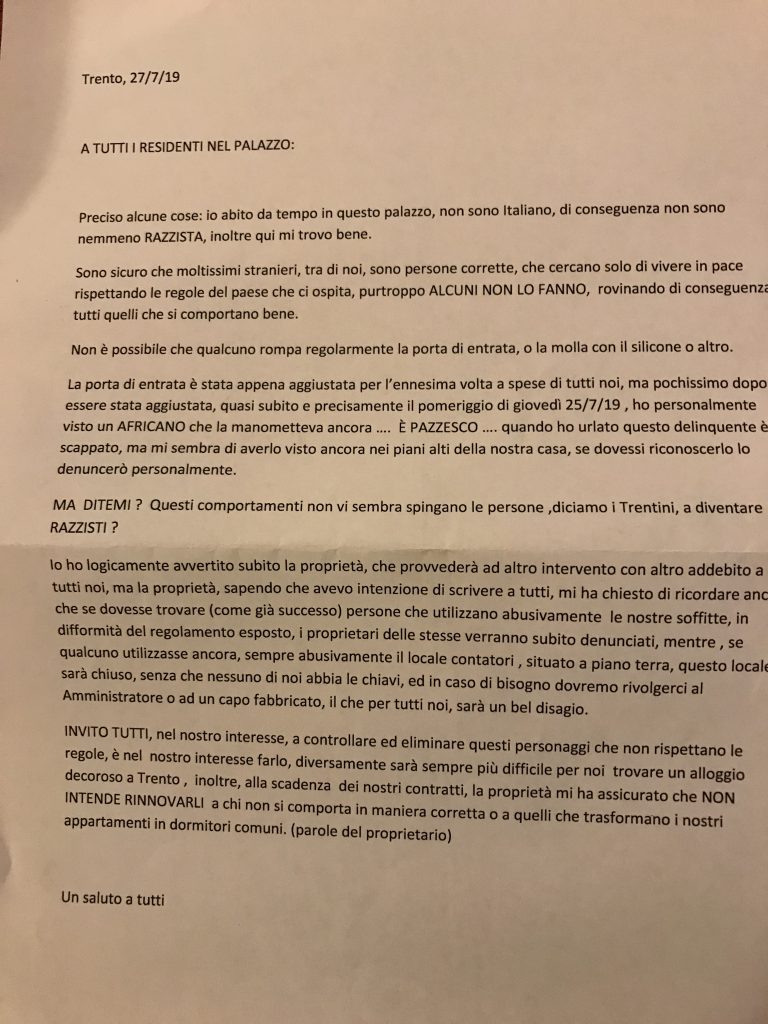 In un condominio trentino, un inquilino straniero scrive una lettera ‘appello’ a tutti i condomini per chiedere il rispetto delle normali condizioni di convivenza. Accusando gli inquilini stranieri come lui, ma evidentemente non come lui:
