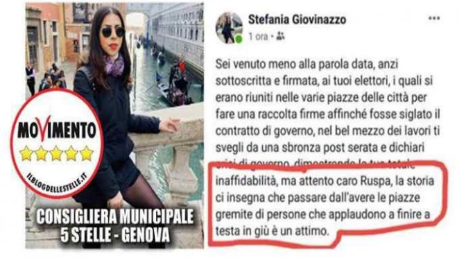 il consigliere Stefania Giovinazzo non si può permettere di dire a Salvini che finirà a testa in giù, per poi pentirsene dicendo che le è scappata la mano. Quando si ha una carica pubblica bisogna sempre ponderare quello che si dice cercando di evitare figure di me…