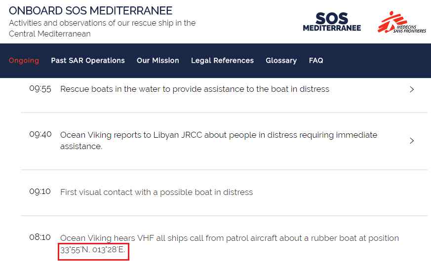 Nel "diario di bordo", @SOSMedFrance e @MSF_ITALIA pubblicano le coordinate dove hanno "trovato" il gommone (33°55’N, 013°28’E) le medesime dove è stato lanciato il rhib #Easy2 alle 2:19.