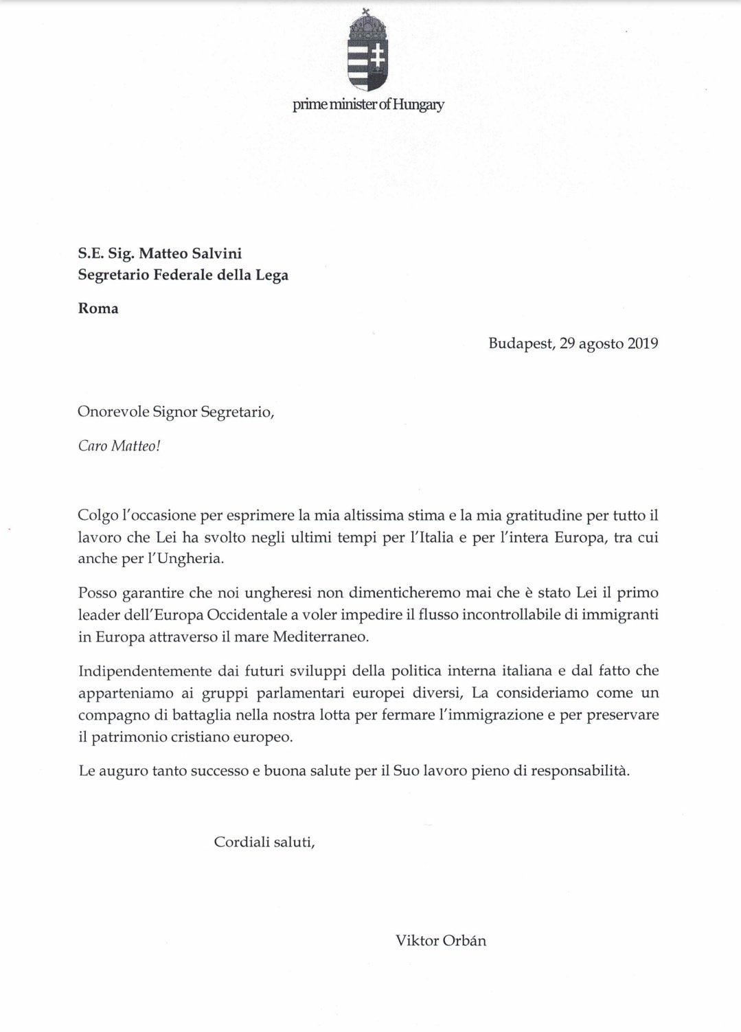 PM Orbán in letter to "brother-in-arms" @matteosalvinimi: We, Hungarians, will never forget that you were the first Western European leader that set out to put an end to the influx of illegal migrants to Europe via the Mediterranean Sea" https://t.co/LoLOTqT6G2