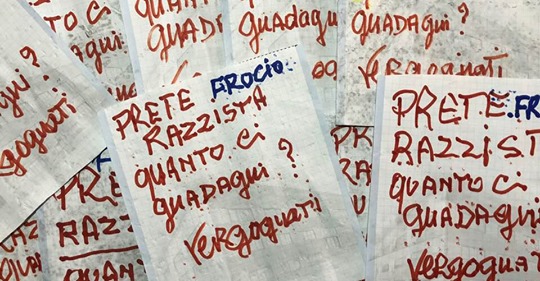 “Prete frocio razzista. Quanto ci guadagni? Vergognati”. Don Massimo Biancalani ha pubblicato su Facebook una foto con questa serie di insulti che sono comparsi su diversi volantini lasciati davanti alla chiesa di Vicofaro dai cittadini.