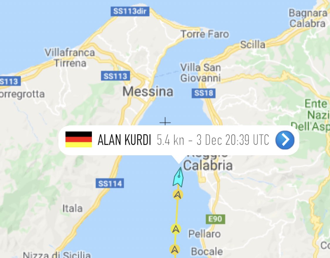A conferma di ciò anche una foto su Twitter, la quale mostra il percorso effettuato dalla Alan Kurdi nelle ultime ore. In essa è ben verificabile come il mezzo ieri sera alle ore 20:39 fosse già in prossimità della costa della città siciliana, trovandosi a poche miglia nautiche dallo stretto di Messina.