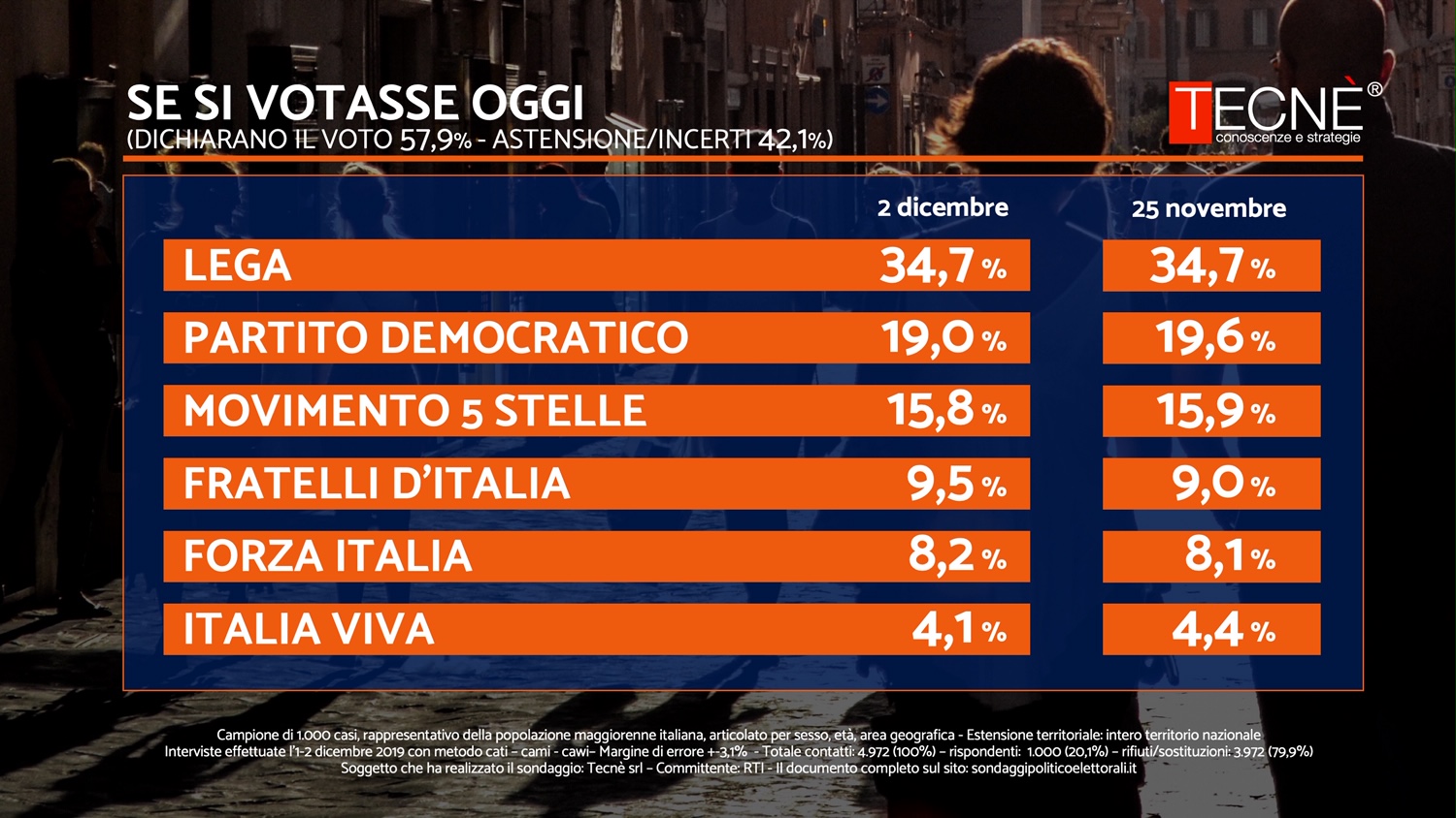 Il fronte sovranista guidato da Salvini è ormai stabilmente sopra il 50 per cento. Con FdI che supera la soglia psicologica del 10 per cento e la Lega in testa con un sottostimato 32,5 per cento.