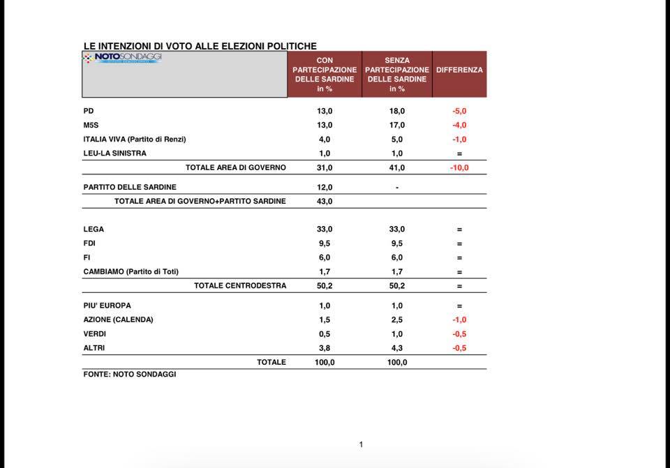 Cosa confermata anche da un altro sondaggio più ottimista per le sardine: