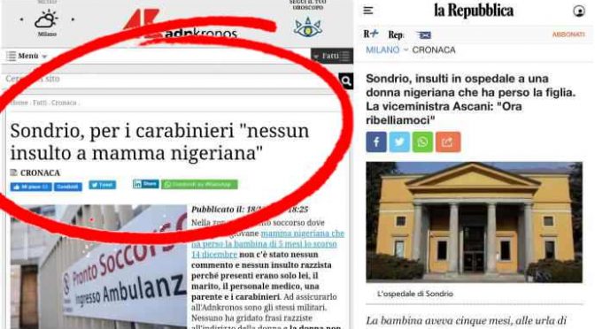 Repubblica colpisce ancora in cooperazione con le sardine E’ ufficialmente una bufala la storiella diffusa da una sardina e poi da tutti i media nazionali della madre nigeriana insultata dopo la morte del figlio: Sondrio, fonte notizia è una sardina. Ospedale: “Nessuno ha sentito offese razziste” Nella zona del pronto soccorso dove sostava la giovane … Leggi tutto Sondrio era una bufala, Carabinieri: “nessun insulto razzista a mamma nigeriana”