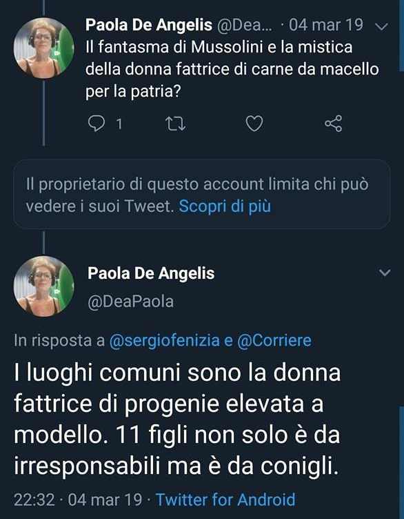 Capito madri di tanti figli? Per @DeaPaola di Radio Rai3, siete delle fattrici fasciste. pic.twitter.com/3mqfrJH5Bh