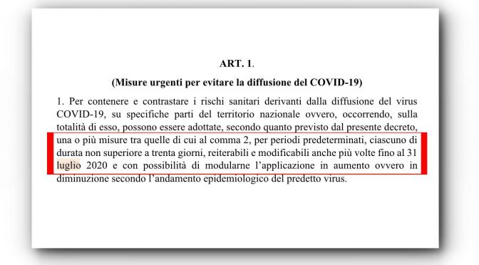 Come già scritto: Il folle piano di Conte: prigionieri fino al 31 Luglio, in arrivo un altro decreto Il governo abusivo si prepara ad emanare un decreto che dà la possibilità allo stesso governo di tenere in casa gli italiani fino al 31 luglio. Prorogando di volta in volta le misure attuali. Una sorta di … Leggi tutto Prigionieri di Conte fino al 31 Luglio: è lui il virus che uccide l’Italia
