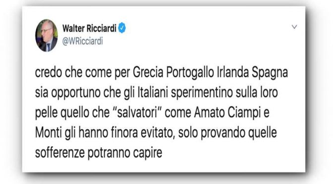 ‼️Marzo 2018 @WRicciardi, membro dell’#OMS e consigliere del ministero della Salute: gli italiani dovrebbero sperimentare sofferenze perché non apprezzano i “salvatori” Amato, Ciampi e #Monti (colui che iniziò con i tagli alla sanità per l’austerity #UE)?#coronavirus https://t.co/4lhFYt3sVv