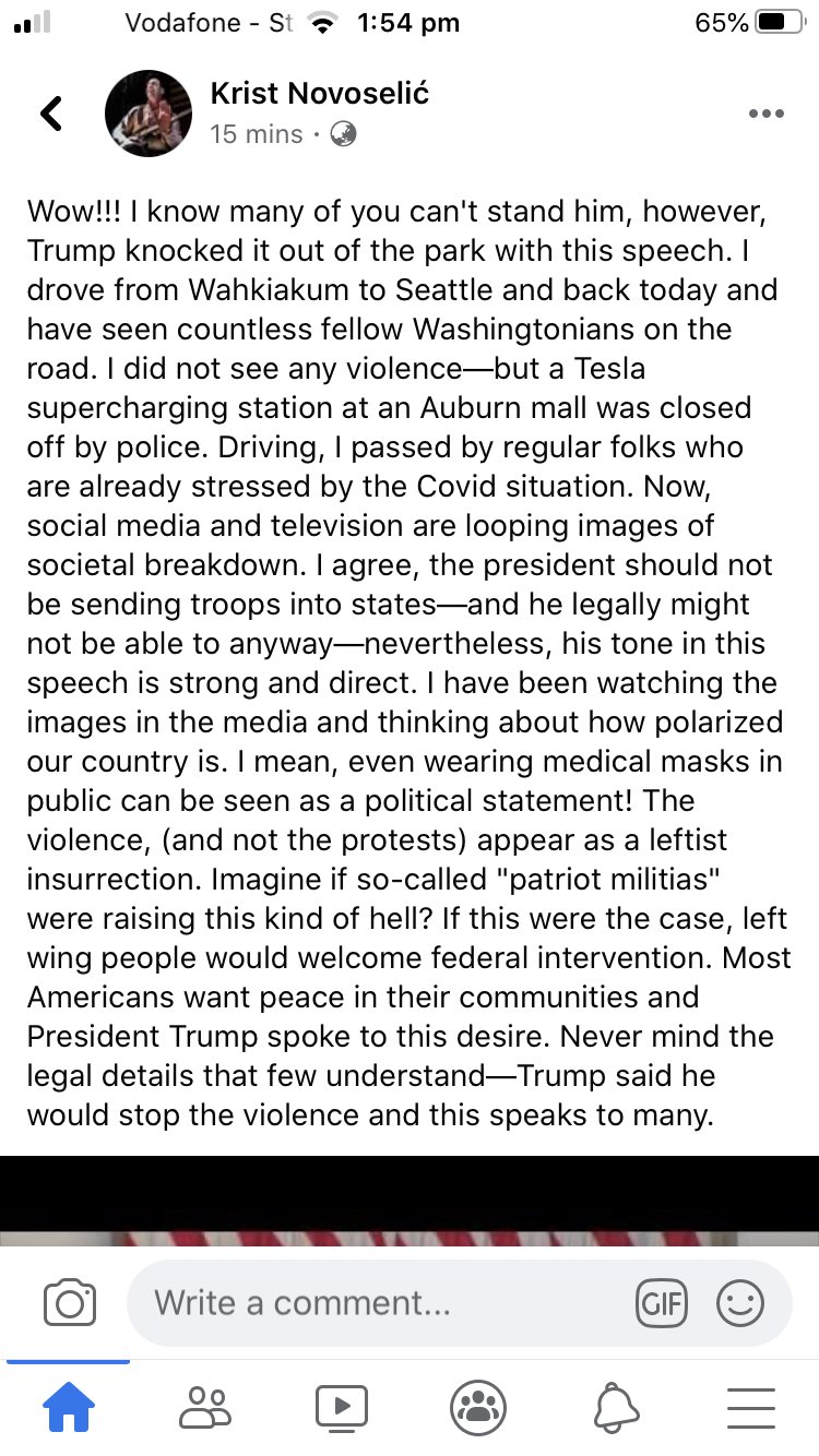 “Ho guidato da Wahkiakum a Seattle e ritorno oggi e ho visto moltissima gente. Non ho visto nessuna violenza” scriveva Novoselic su Facebook “ma una stazione di servizio era stata chiusa dalla polizia. Guidando, ho visto passare persone normali, già stressate dalla situazione del covid. “Sono d’accordo, Trump non avrebbe il diritto di mandare truppe negli altri stati ma il tono nel suo discorso è stato forte e diretto”. “La violenza (e non le proteste) sembrano in effetti un’insurrezione di sinistra” scrive ancora l’ex bassista dei Nirvana, e aggiunge: “Immaginate se le cosidette “milizie patriottiche” stessero facendo lo steso casino: quelli di sinistra chiederebbero l’intervento dei federali! Ma la maggior parte degli americani vuole pace. E Trump ha espresso questo desiderio. Lui ha rassicurato molti sul fatto che la violenza sarebbe cessata”.