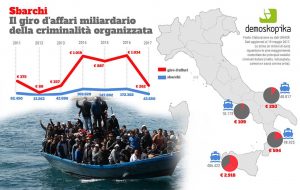 ARRIVA IL PD AL GOVERNO, BOOM DI AFFARI PER LE MAFIE – Sono oltre 650 mila i clandestini scaricati in Italia dal 2011 ad oggi che hanno generato un guadagno illecito pari a circa 4 miliardi di euro con un incremento di oltre 300 punti percentuali nel triennio 2014-2016 rispetto al triennio precedente. È quanto emerge dalla Nota scientifica dell’Istituto Demoskopika “Sbarchi. Il giro d’affari della criminalità organizzata” che ha analizzato il flusso dei clandestini nelle aree a maggiore condizionamento ambientale della criminalità organizzata italiana nel periodo che va dall’inizio dei governi non eletti, dal 2011 ad oggi.