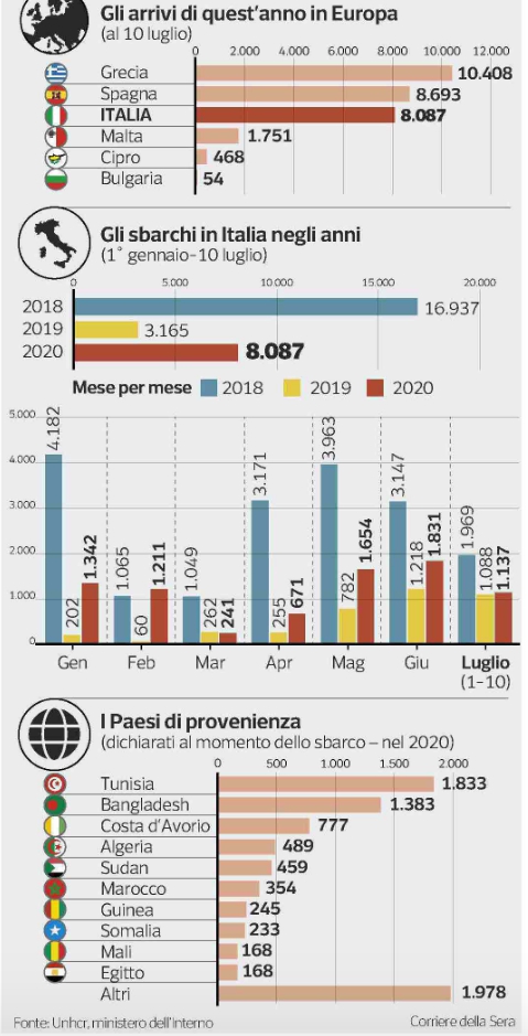 Dalla Sicilia alla Sardegna, passando per la Calabria. I migranti assediano le coste italiane. E ora scatta l’emergenza. In realtà un piano di invasione che sembra studiato dal governo per accelerare la seconda ondata di coronavirus e prolungare così i pieni poteri e annullare le elezioni regionali di settembre. Non si spiega in altro modo l’idiozia governativa sugli sbarchi.