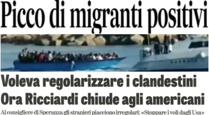 BREAKING NEWS, CORONAVIRUS Il governo ha deciso: stop ai turisti e porte aperte ai clandestini Luglio 16, 2020 Vox 3 commenti Vox Condividi! Il risultato è questo: JESOLO: 43 IMMIGRATI POSITIVI IN MEZZO AI TURISTI, GRAZIE ALLA CROCE ROSSA Vox Oggi boom contagi coronavirus ‘grazie’ a barconi, centri accoglienza e ritorno immigrati dall’estero Segui Vox
