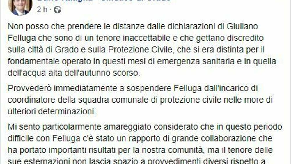 Non posso che prendere le distanze dalle dichiarazioni di Giuliano Felluga che sono di un tenore inaccettabile e che gettano discredito sulla città di Grado e sulla Protezione Civile, che si era distinta per il fondamentale operato in questi mesi di emergenza sanitaria e in quella dell’acqua alta dell’autunno scorso.