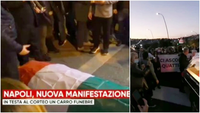 L'Italia che lotta non si ferma: decimo giorno di protesta. Numerosi cittadini a Napoli protestano contro lockdown e governo Conte. In cima al corteo una bara col tricolore: "Conte hai ucciso l'Italia!" Restiamo uniti, scriveremo la storia. Libertà! #Lockdown #Conte pic.twitter.com/IVp2sFTrzf