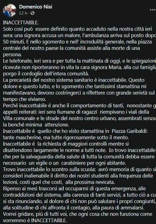 “Una signora accusa un malore, l’ambulanza arriva sul posto dopo 50 minuti. E nello sgomento e nell’incredulità generale, nella piazza centrale del nostro paese la comunità assiste alla morte di una persona”. A raccontare quanto accaduto sabato 7 novembre di sera è su Facebook il sindaco di Noci, Domenico Nisi, sfogandosi: “È inaccettabile”. “Le telefonate e le spiegazioni ricevute – prosegue – non riporteranno in vita la cara signora Maria, alla cui famiglia porgo il cordoglio dell’intera comunità. La precarietà del nostro sistema sanitario è inaccettabile. Questo dolore e questo lutto, e lo sgomento devono costringerci a riflettere con grande serietà sul tempo che viviamo”.